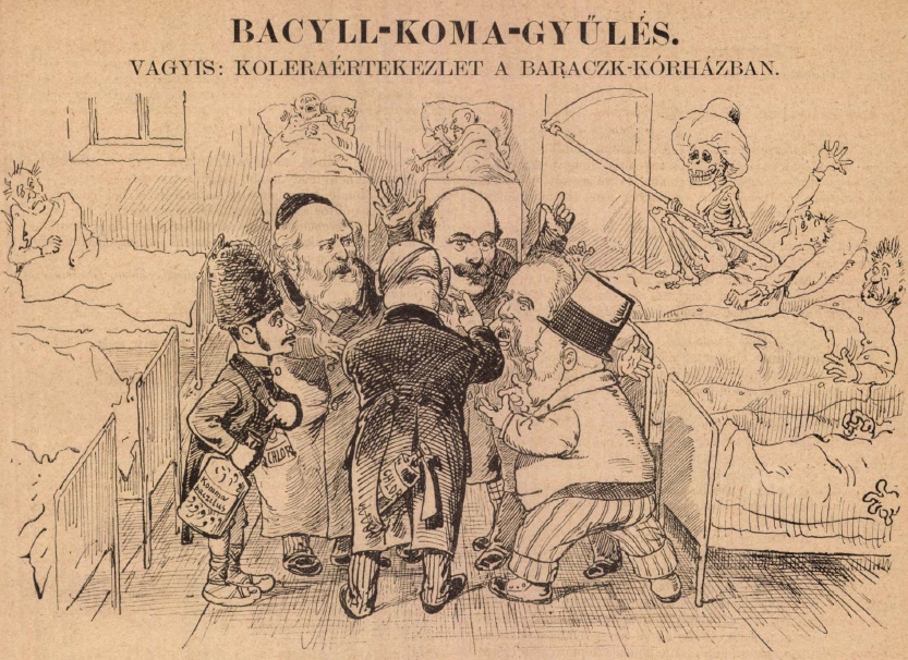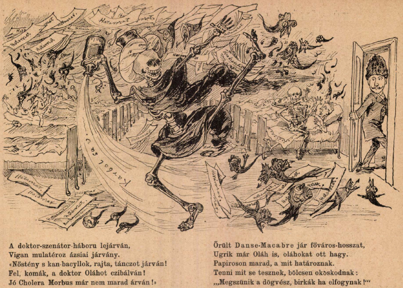 As the Doctor-Senator War comes to an end, The Asian contagion is carousing merrily. “Female and male bacilli, let’s get dancing! Rise up, comma-bacilli, Dr. Oláh* urges them! Good Cholera Morbus is no longer an orphan!” Crazy Danse Macabre runs the length of the capital, Oláh is already skipping out, leaving the Wallachians** there. What has been decreed remains on paper. Doing whatever they do, they reason wisely: “The pest will disappear, they’re sheep if they run out!” (*Presumably Gyula Oláh, physician, public health figure, and former parliamentarian) (**Punning on Oláh’s name, which could also mean a derogatory term for Romanians.) (Bolond Istók, Budapest, 1886)