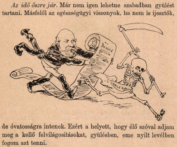 This image is singled out from a series mocking the Hungarian minister of public works and transport, Baron Gábor Kemény. Known as an advocate of Hungarian economic modernization, Kemény seems to be faulted here for raising long-winded written objections to convening the next session of parliament, at a time when cholera was recurring in Hungary. “It is getting on toward autumn,” writes the satirist in his voice. “It would no longer be possible to hold an outdoor session. On the other hand, health conditions, if not frightening, do call for caution. Therefore, instead of giving the appropriate clarifications in person at the session, I will do so in this open letter.” Here even cholera is put off by his stentorian prose. (Bolond Istók, Budapest, 1886)