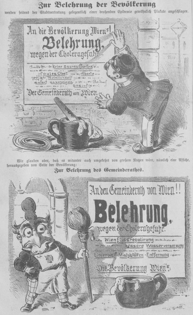 For the instruction of the populace posters of an impending epidemic will occasionally be put up by the city council. (The first poster forbids sour pickles, rotten vegetables, and (I think) abortions (!), while demanding cleanliness.) We believe, however, that it would also be immensely useful to include a placard published on behalf of the populace: For the instruction of the city council. (The second poster wants better channeling of the Danube river against floods, better water services, better waste removal.) (Kikeriki, Vienna, 1886)