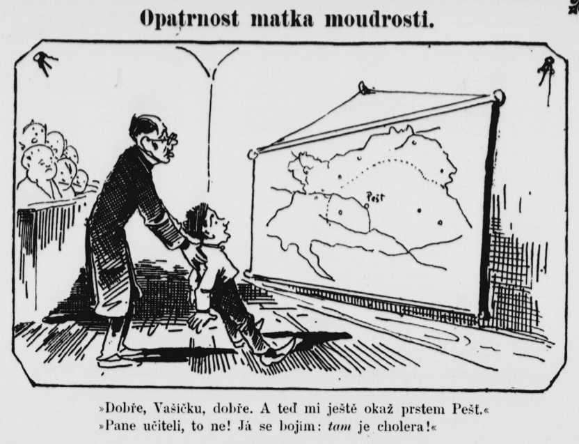 “Good, Vasicka, good. And now point your finger at Pest.” “Teacher, not that! I’m afraid that there it’s cholera.” (Humoristické listy, Prague, 1886) (A nearly identical French cartoon.)