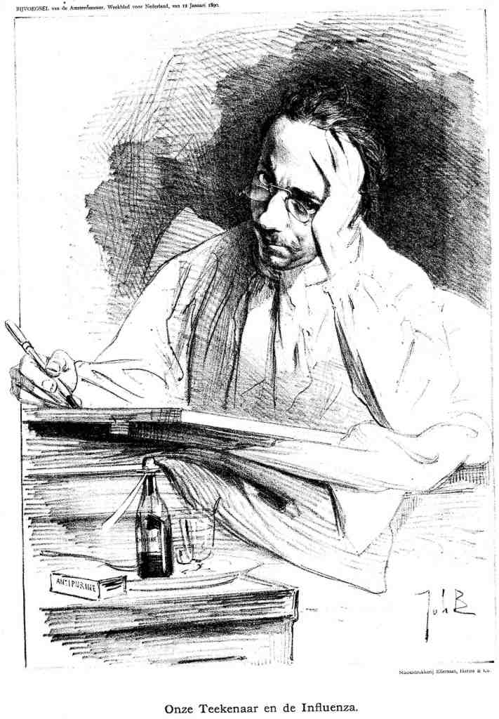 This spare image is fascinating, appearing when an influenza epidemic had prevailed for more than two months in the city of Amsterdam, at a dramatic cost of nearly one in thirty residents every week. The artist, his own medicaments at hand, seems to be contemplating, not so much his own clinical predicament, but how to represent the crisis in visual terms. The self-portrait might represent his interim solution to a dilemma he is not sure how to address satirically. (The irregular Bijvoegsel supplement was most often humorous in content.)