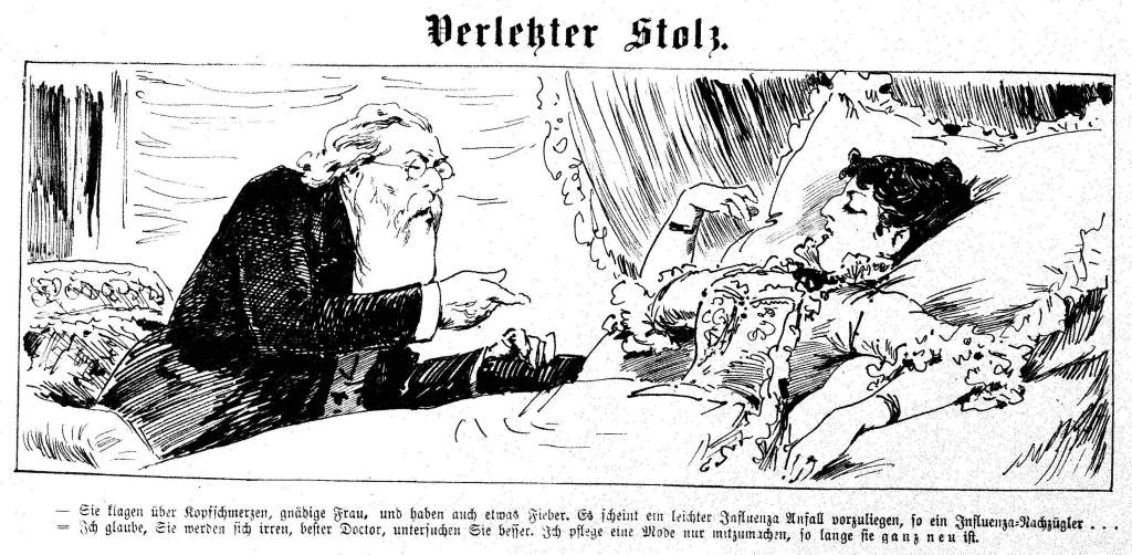 “You complain of headache, madame, and you also have some fever. It seems to be a mild case of influenza, a sort of influenza-straggler…”