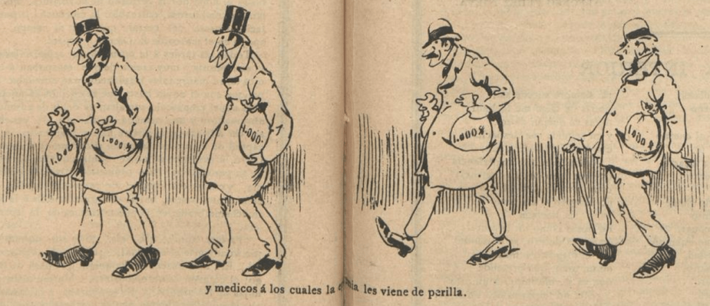A multi-panel narrative by Mecachis (the pen name of Eduardo S. Hermua) in La Semana Cómico, Barcelona, 1890.