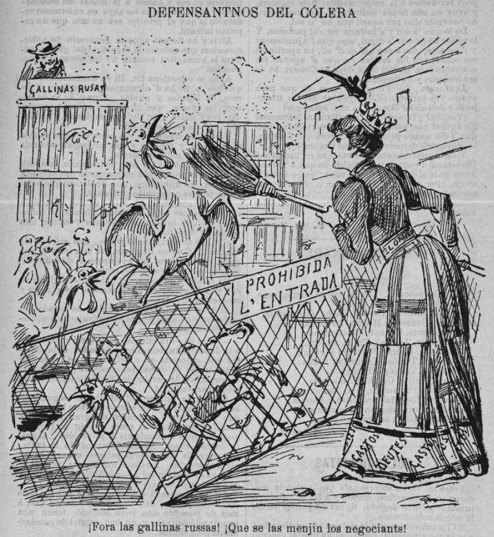The Spanish monarchy guarding the “No entry” gate. “Out with the Russian chickens! Let the merchants handle them!” (I’m ignorant of the politics, but the dress has “debt expenses” stenciled on it, and we may presume that the state minimizing its role in fighting the cholera epidemic is being derided here.) (La Esquella de la torratxa, Barcelona, 1892)