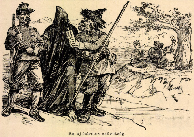 Little boy: “Boda, she must have it good now.” “Why, foolish boy?” “Well, at least she doesn’t have to be afraid of any cholera.” (Kikeriki, Vienna, 1892)
