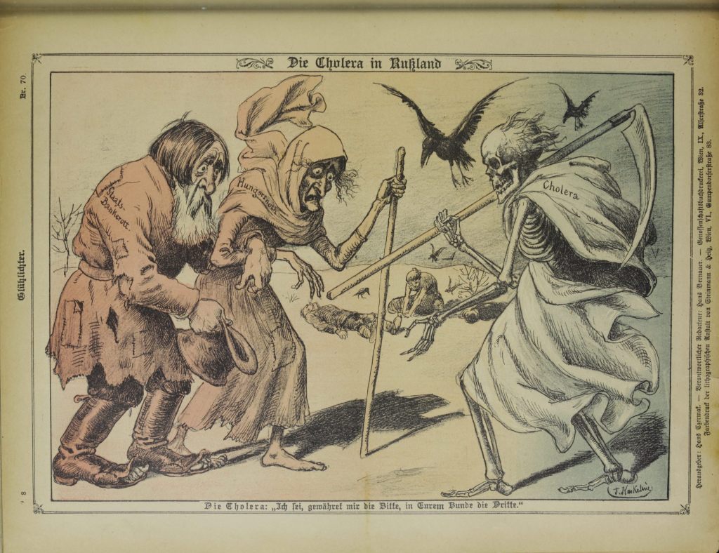 (Figaro, Vienna, 1892) (There is a similar image from the 1918 flu pandemic. The satirical theme goes back at least to 1832, in this marvelous example preserved by the Wellcome Collection.)