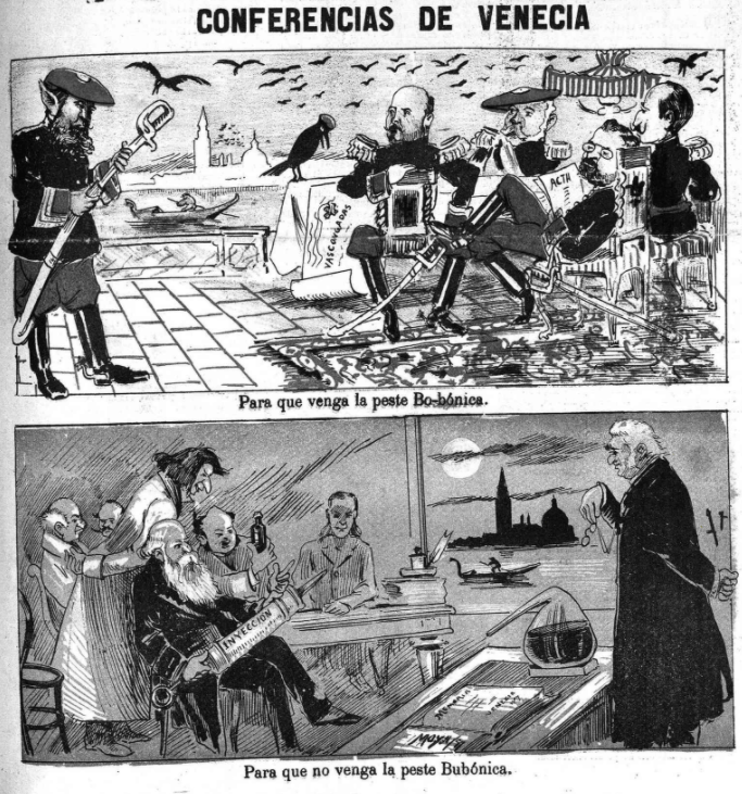 1) So that the plague of fools comes. [something to do with the need to negotiate with the Basque Provinces] 2) So that the bubonic plague does not come. [The tenth international sanitary conference was held in Venice this year, and devoted to discussion of bubonic plague.] (Gedeón, Madrid, 1897)