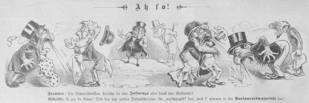 An uncomfortable reminder of the prevalent anti-Semitism in Vienna at the fin-de-siècle. Stranger: “For heaven’s sake, does an influenza prevail there or some other kind of epidemic?” Kikeriki: “Not a trace! This is only coming from our Jewish-Liberals, who are “sniffing” in irritation because they’re never in the parliamentary majority!” (Kikeriki, Vienna, 1897)