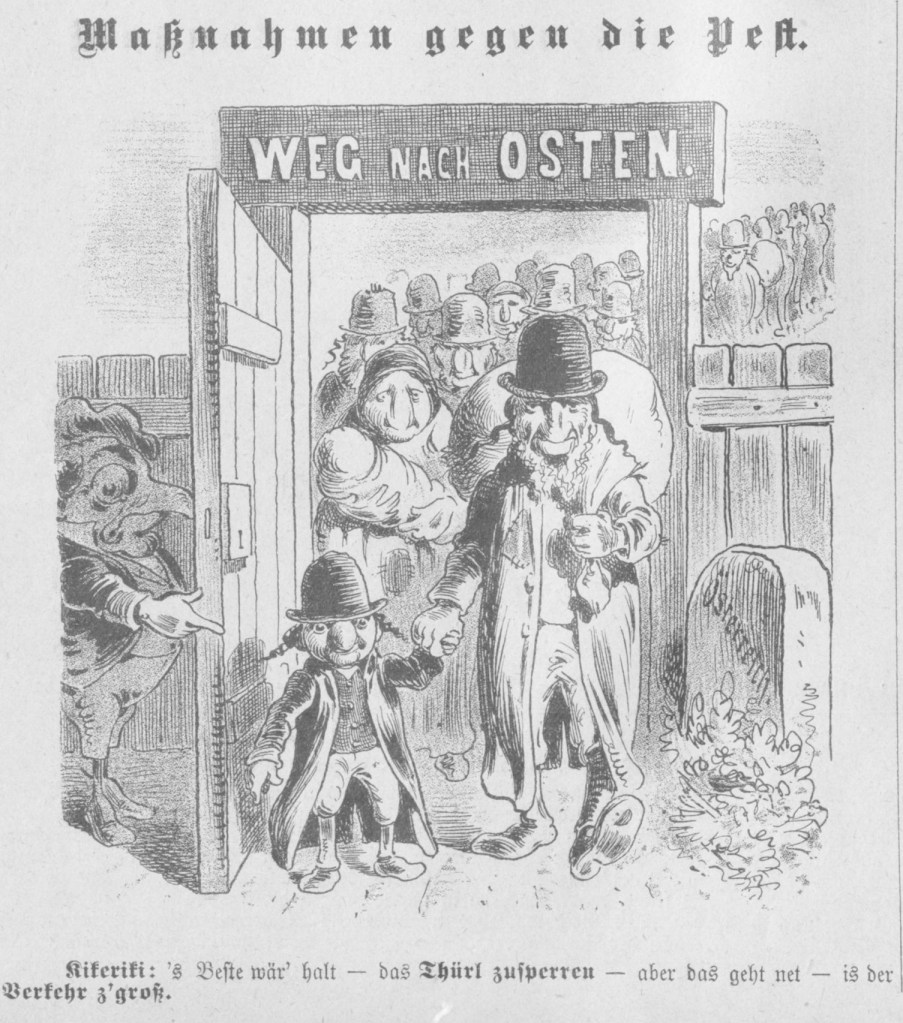 Entitled “Measures against the plague,” the cartoon depicts a gate into Austria with a sign above it: “The way to the East.” Kikeriki: “The best thing would be to lock the doors, but that won’t do, the traffic is too large.” (Kikeriki, Vienna, 1897)
