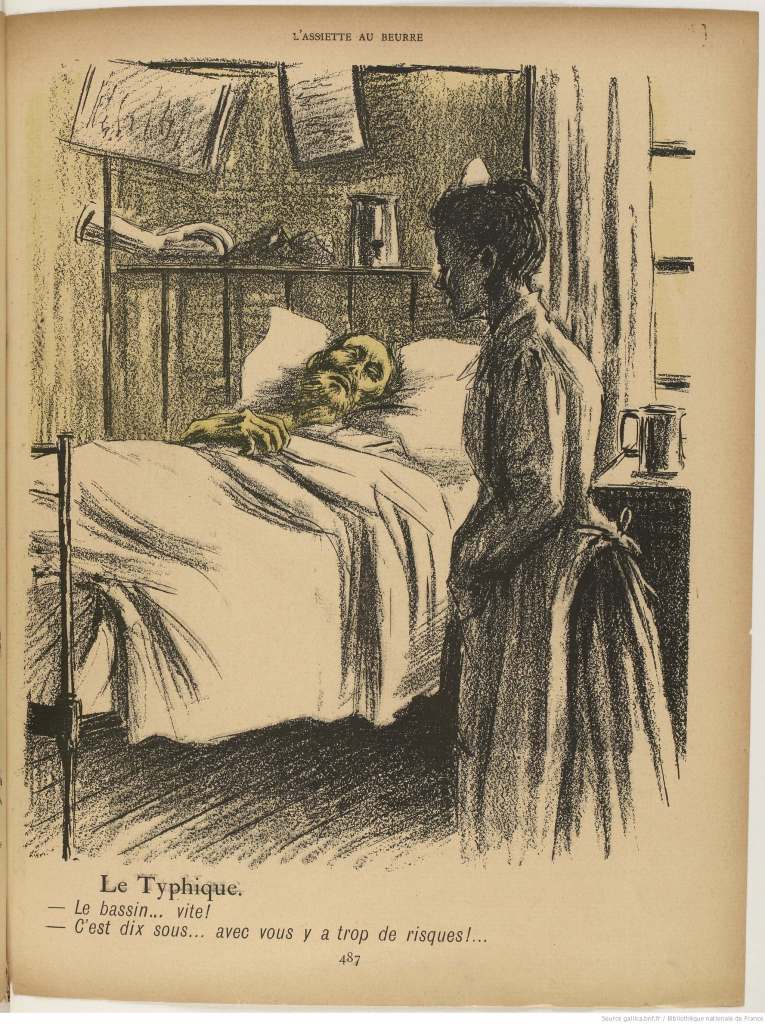 The typhus patient “The basin… quickly!”“It costs ten sous… with you there are too many risks!…”(L’Assiette au beurre, Paris, 1901) French typhus cartoon