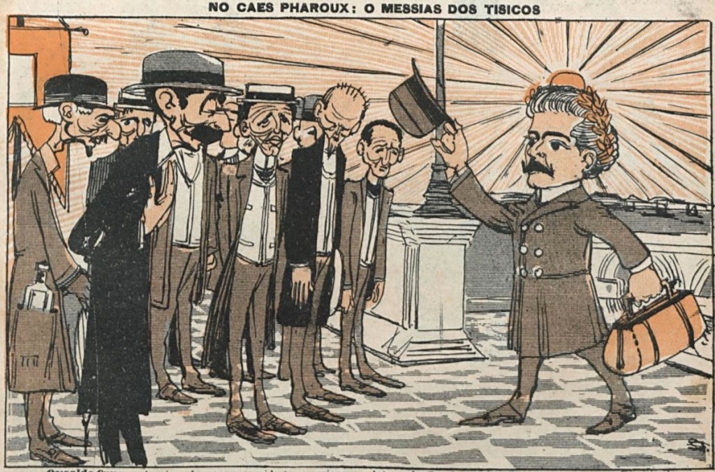 I lack the Portuguese knowledge to translate all these cartoons in full, but in this post I just want to highlight the iconic status of bacteriologist and public health leader Oswaldo Cruz (1872-1917). For an avowedly secular publication like O Malho, Cruz as the standard-bearer of modern medicine clearly exerted tremendous appeal, though of course its satire often drew attention to the many obstacles in the way of achieving his aims.