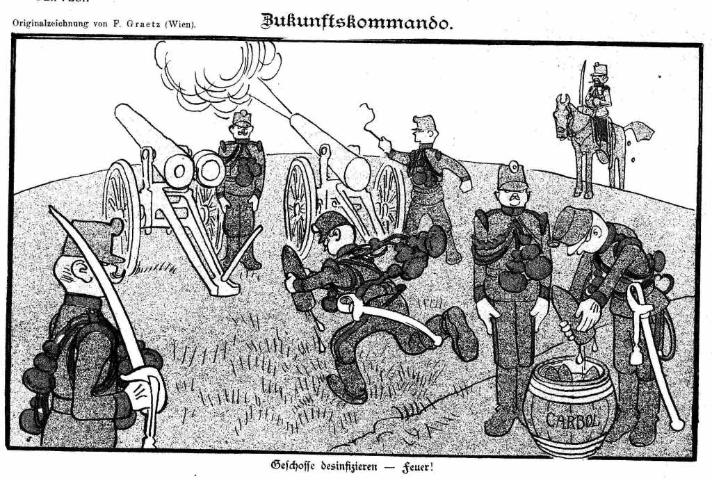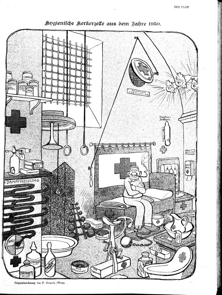 In May 1906 Archduke Franz Salvator opened a large international hygiene exhibition in Vienna. In early July the first major revision to the Hague Convention was adopted in Geneva, among other things strengthening the protections for prisoners of war. The International Committee of the Red Cross was especially prominent in pressing for these provisions, surely strengthening the modern conviction that enforced confinement should be sanitary. In this image we see a “hygienic dungeon cell from the year 1950,” as imagined in Viennese satirical magazine Der Floh in June 1906. Note how all the accoutrements come with the Red Cross symbol.