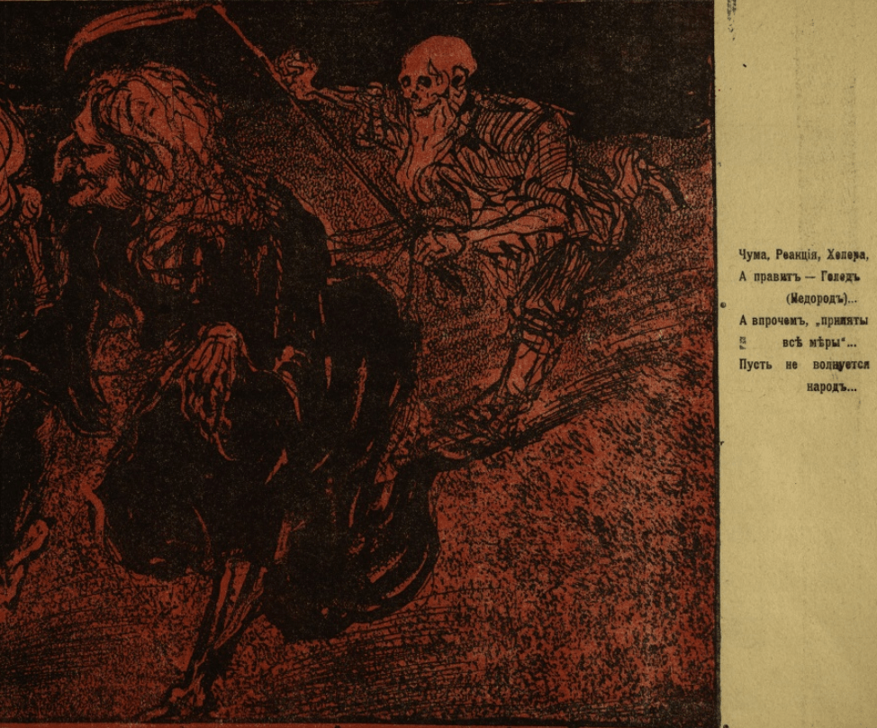 Here is the dashing troika tearing down the high road Three old witches howling, barking, shaking their shaggy heads: Plague, reaction, cholera, but it is hunger (malnutrition) that holds the reins… “All measures have been taken,” however… The people should not be agitated… (Pulemet, St. Petersburg, 1906)