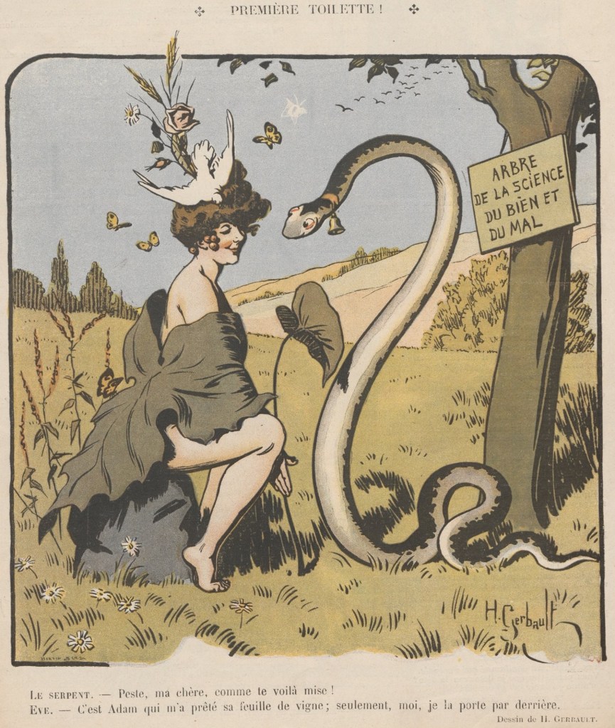 (Under the Tree of the Knowledge of Good and Evil.) The serpent: “My dear pest, look at how you are arrayed!” Eve: “It was Adam who lent me his fig leaf; it’s just that I carry it from behind.” (Le Rire, Paris, 1906) (OK, this is a stretch, since it is not literally about the plague, but in a quirky way it seems to connect original sin with unpleasant modes of disease transmission. Perhaps I am committing the sin of Freudian overinterpretation. Or more likely my grasp of French idiom is not adequate to this case.)