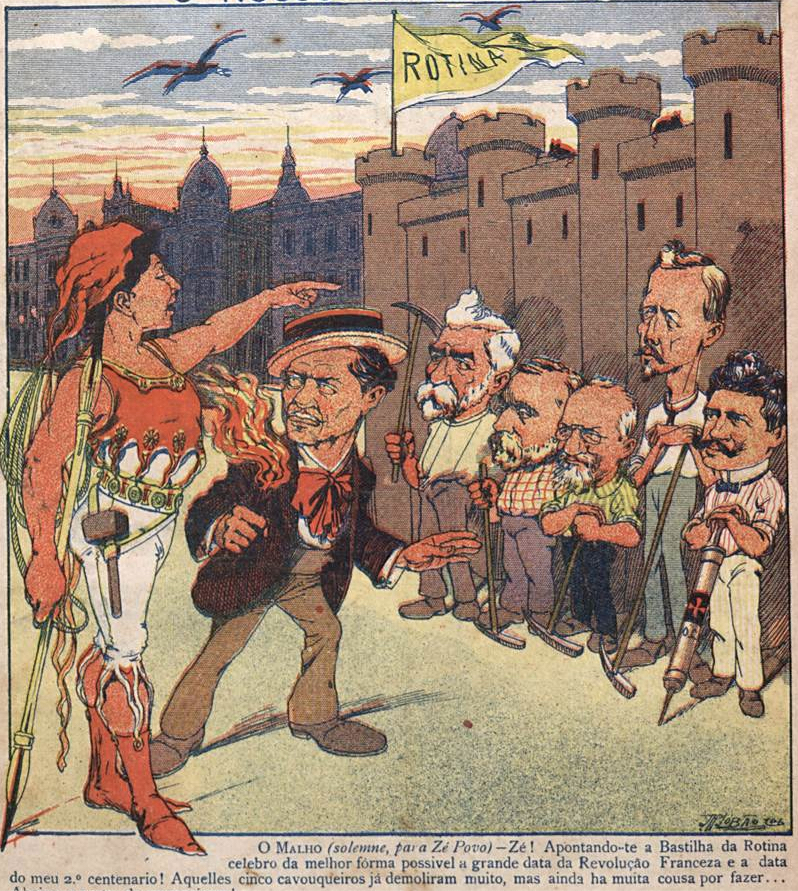 O Malho [The Sledgehammer] (solemnly, to Joe Public): “Drawing your attention to the Bastille of Routine, I celebrate in the best possible way the great date of the French Revolution and the date of my second centenary! Those five diggers [with public health official Oswaldo Cruz on the right, holding a syringe] have already demolished a lot, but there is still a lot to do… Down with any remaining attachment to the status quo!” Joe Public: “Me as well! I want schools! I want housing for the poor! I want a steady fight against tuberculosis! … Let there be money!“ (O Malho, Rio de Janeiro, 1906)