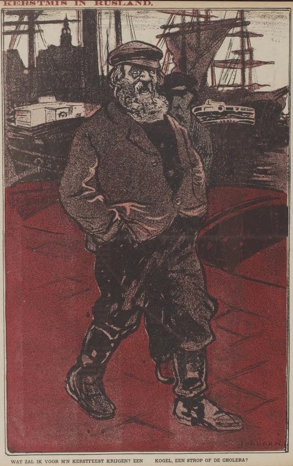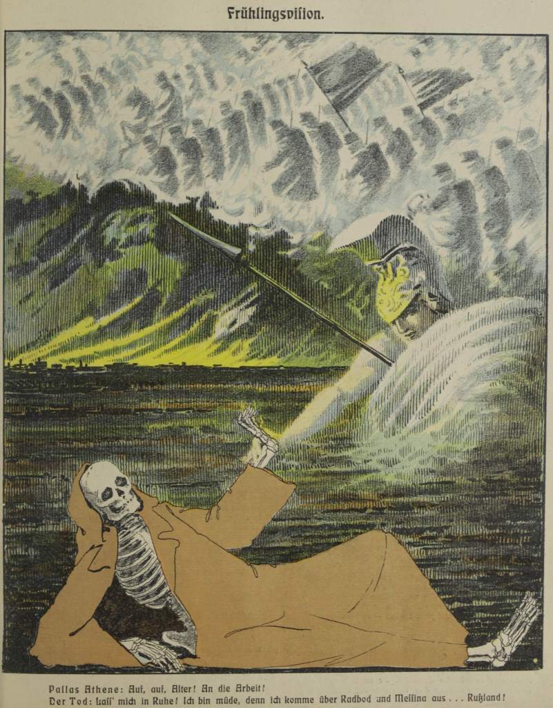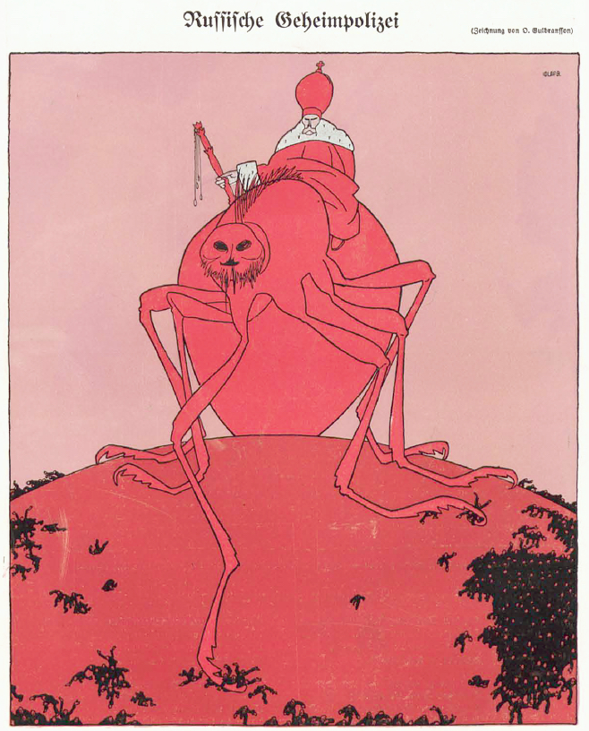 In 1908 a typhus epidemic began spreading from the northern Caucasus and southern Russia to the more densely populated northwestern districts of the Romanov Empire. By and large the epidemic failed to reach further west in Europe, but that did not prevent the German magazine Simplicissimus from offering this curious variant of the classic trope of disease as invasive agent.