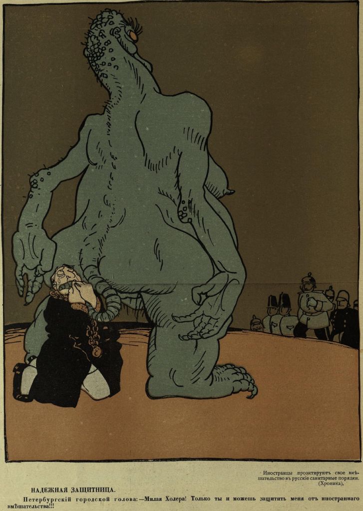 St. Petersburg leaders: “Dear Cholera! Only you can protect me from foreign interference!!!”(Satirikon, St. Petersburg, 1910)