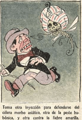 He takes another injection to defend himself from Asian cholera morbus, another against bubonic plague, and another against yellow fever.