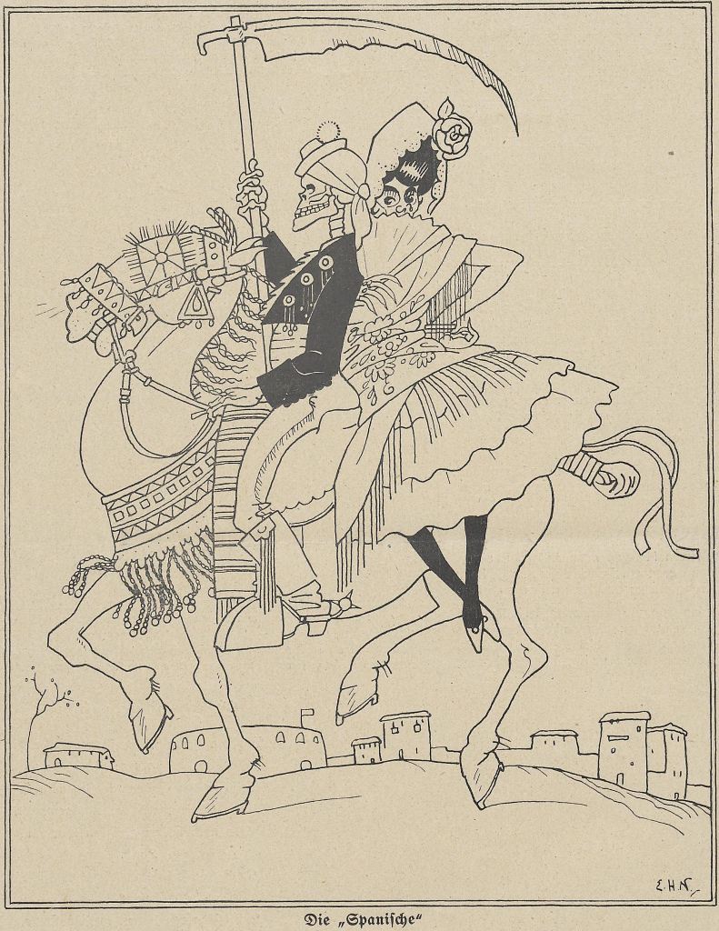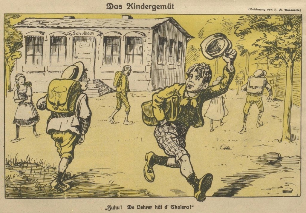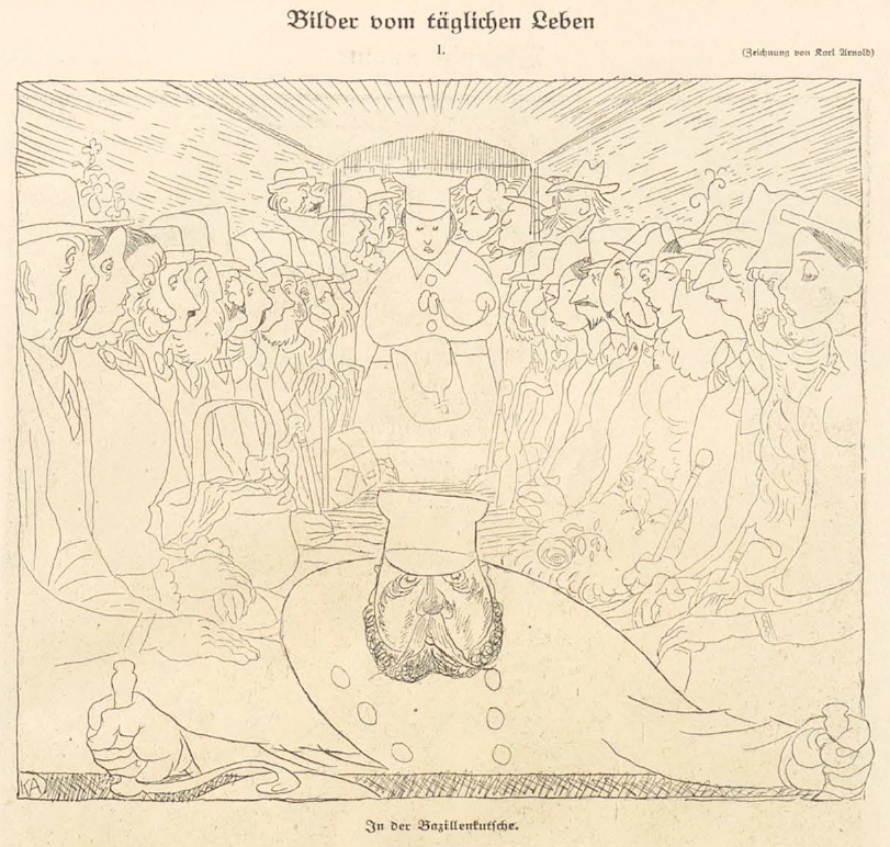 Depicting the close quarters of public transportation during the flu pandemic of 1918. It is worth noting that this may be the only such flu-related image in Simplicissimus that fall. The unusual term “Bazillenkutsch” is sometimes attributed to Robert Koch at the time of the opening of the U-Bahn in working-class Kreuzberg in 1902, perhaps via a 1908 novella by Eduard Goldbeck (not confirmed). Kaiser Wilhelm later gave the term wider notoriety when he visited a new stretch of the U-Bahn and insisted that he would only sit in a brand-new subway car, fearing infection from previous riders. This in turn moved the Berliner Volks-Zeitung to reassure its readers that this perception of germs ran counter to years of medical and scientific efforts to demonstrate otherwise, and the average subway car was not, in fact, the center of an epidemic.