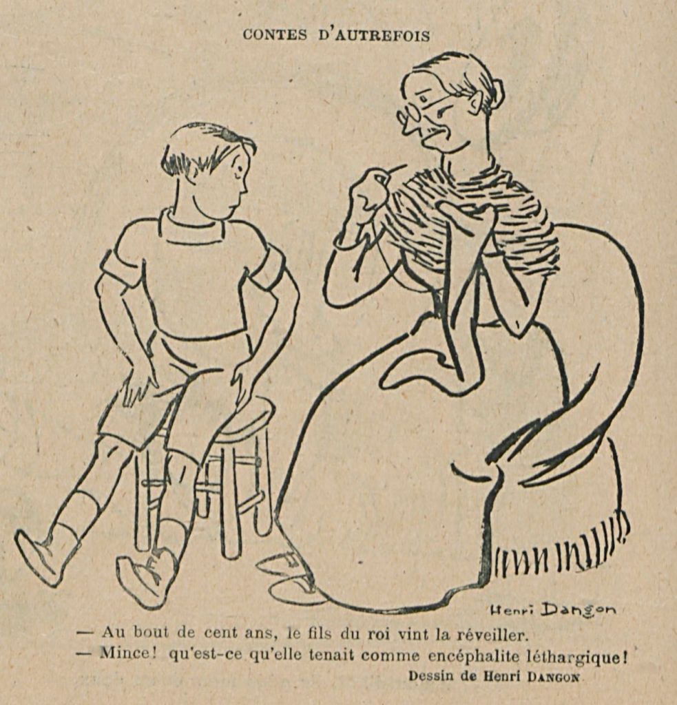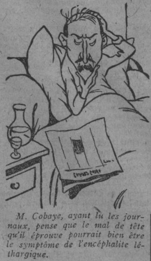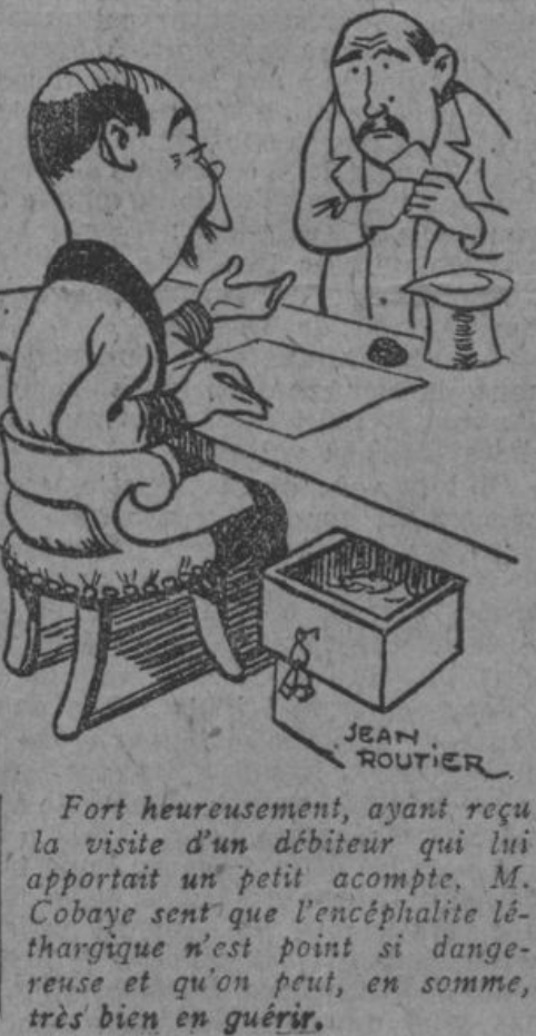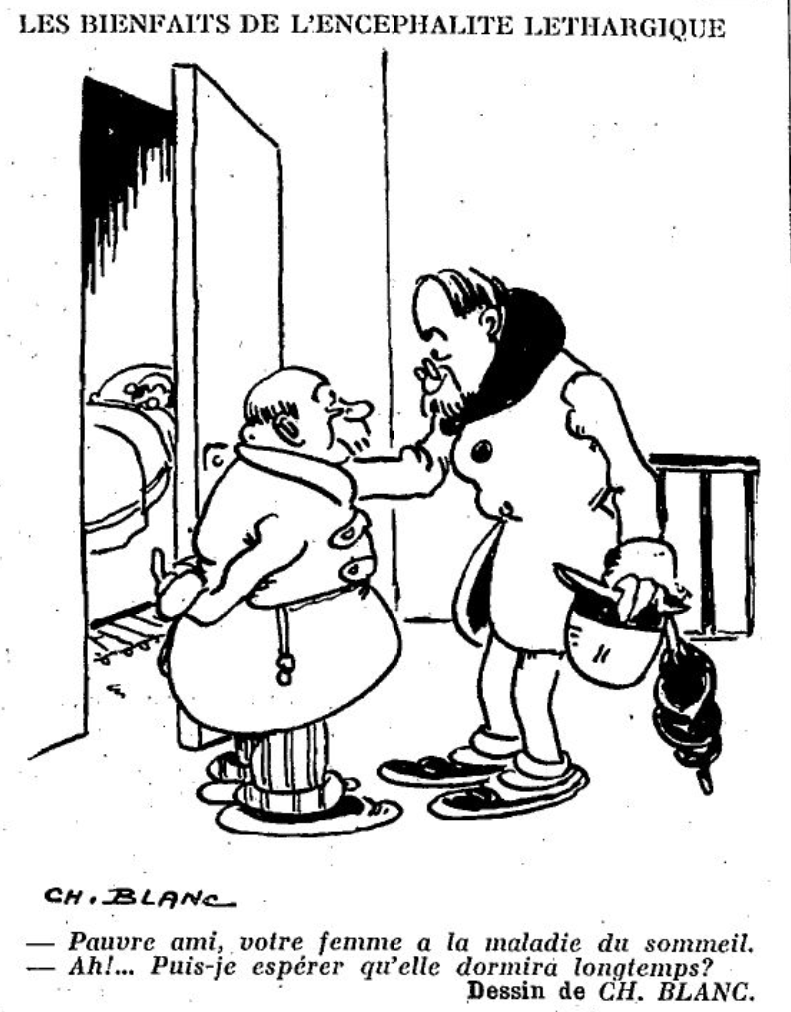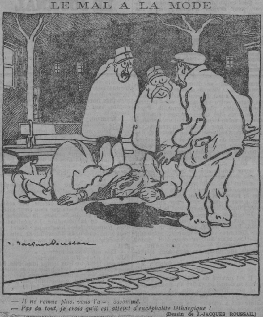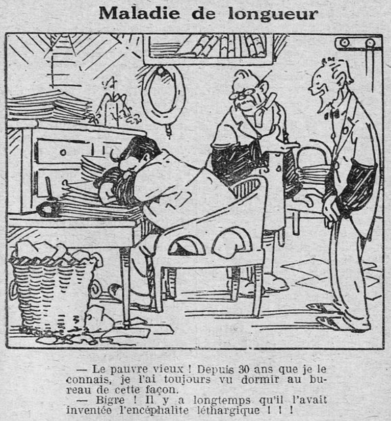 “Poor old man! In the 30 years that I’ve known him, I have always seen him sleep in the office like this.” “My goodness! It’s a long time since he invented encephalitis lethargica!!!” (Le Petit Journal, Paris, 1920) (Presumably punning on the sense of languor.)