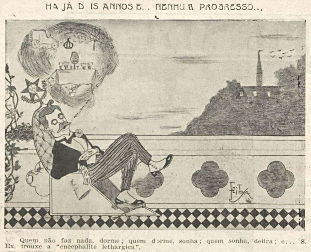 Whoever does nothing, sleeps; whoever sleeps, dreams; whoever dreams, is delirious; and… His Excellency has got “encephalitis lethargica.” (O Malho, Rio de Janeiro, 1920)
