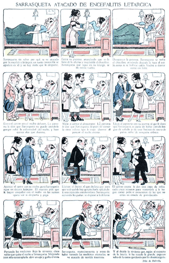 Sarrasqueta, without knowing why, is attacked by encephalitis lethargica: an irresistible slumber takes hold of him and there is nothing to wake him up. His landlady enters announcing that it is office time and bringing him hot chocolate. Sarrasqueta, who is still in his lethargy, turns around. The landlady disappears, Sarrasqueta takes the chocolate, then throws the cup on the ground, as if it had been broth. He goes back to sleep like a dormouse. …… And when the maid told him that, according to the summary from the lottery, he had won the big one, he jumps out of bed and is finally delethargized. (Caras y Caretas, Buenos Aires, 1920) (The available scan is rather low resolution, so it’s not worth breaking up into individual panels.)