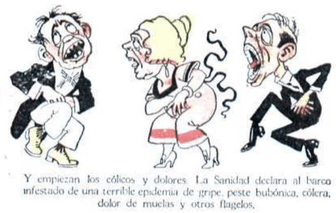 And the cramps and pains begin. The Health Department declares the ship infected with a terrible epidemic of influenza, bubonic plague, cholera, toothache, and other scourges..