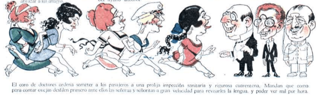 The choir of doctors orders the passengers to undergo a thorough health inspection and rigorous quarantine. As if counting sheep, they first order the ladies to parade before them at great speed to check their tongues, and to be able to see a thousand an hour.