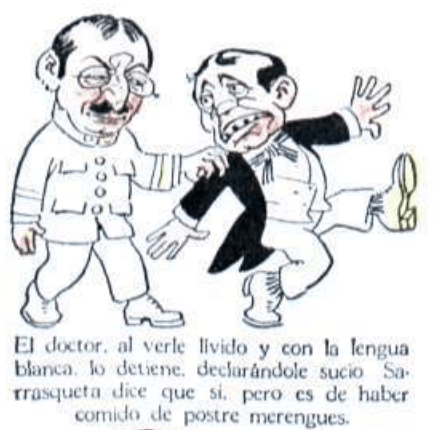 The doctor, seeing him pale and with a white tongue, stops him, declaring him unclean. Sarrasqueta accedes, but claims it is from having eaten meringues for dessert.