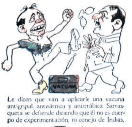 They tell him that they are going to give him a vaccine against flu, scabies, and rabies. Sarrasqueta defends himself by saying that he is neither a test body, nor a guinea pig.