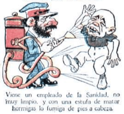 A public health employee arrives, not very clean, and with a fogger for killing ants he fumigates Sarrasqueta from head to toe.