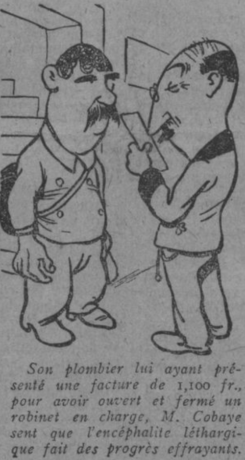 His plumber having presented him with an invoice for 1,100 francs, responsible for having opened and closed a faucet, Mr. Guineapig feels that encephalitis lethargica is making frightening progress.