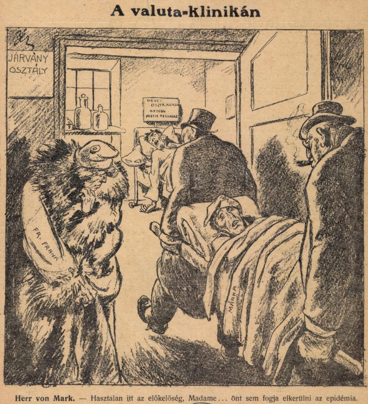 When contagion metaphor and economic analogy join forces to manifest our anxieties at a time of high inflation: “At the currency clinic” (epidemic department). Patient name: Austrian crown. Disease: Pestis pecuniae. Fur-swathed French franc in the waiting room. German Herr von Mark: “Your prominence is useless here, Madame… The epidemic will not avoid you.” (Borsszem Jankó, Budapest, 1922)