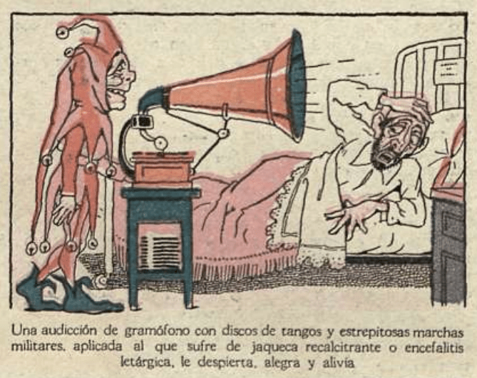 Playing the gramophone with tango records and noisy military marches, applied to those who suffer from persistent migraine or encephalitis lethargica, awakens, rejoices, and relieves them.