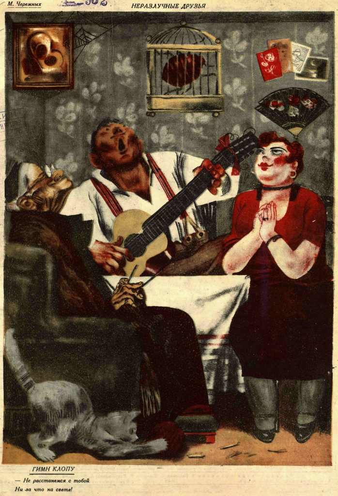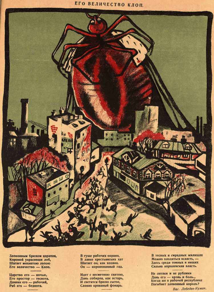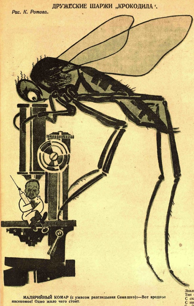 Malarial mosquito (gazing in horror at People’s Commissar of Health Nikolai Semashko): “Here is a harmful insect! One of its stings’ll cost you.”