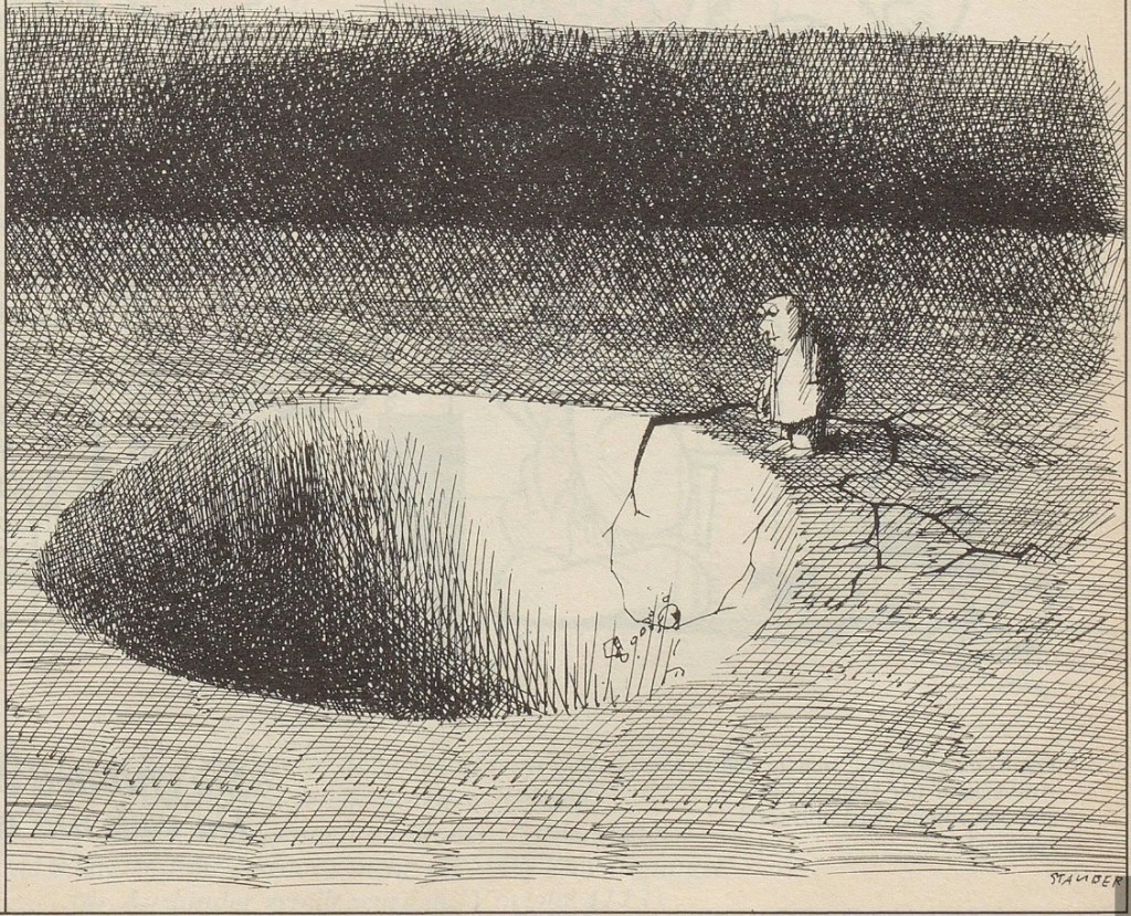 Caution, flu! Illustration by Stauber, accompanying a short story by Peter Heisch.(Nebelspalter, Zurich 1979) Swiss flu cartoon