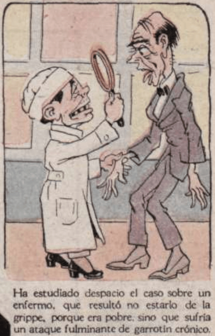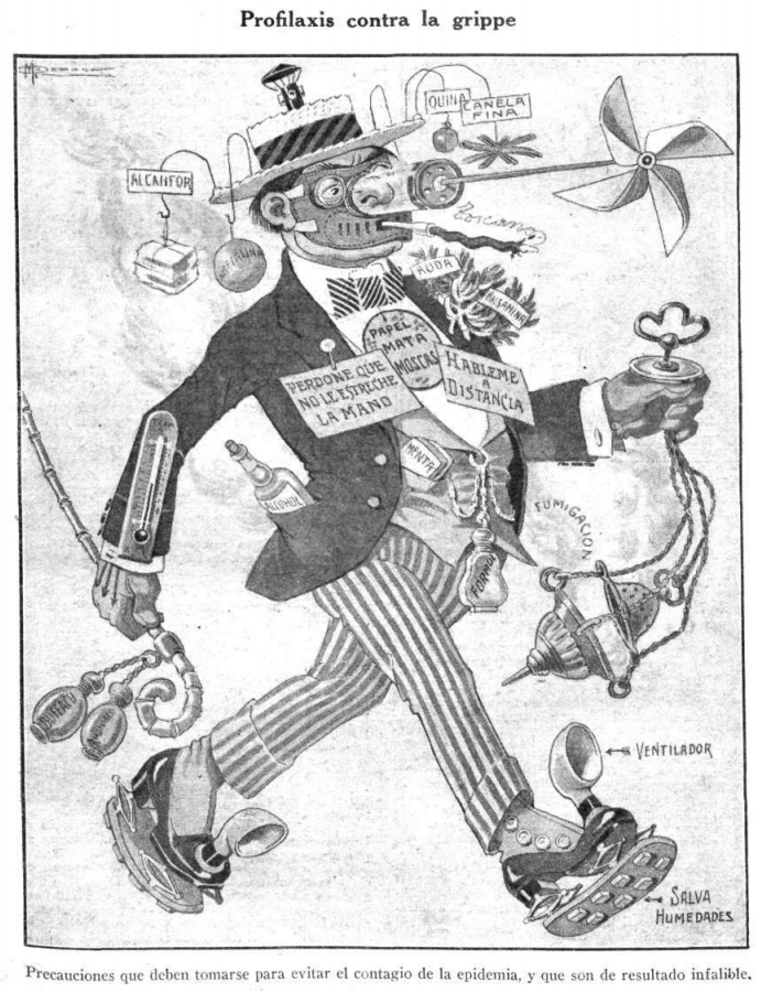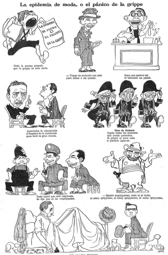 “All the press is propagating the notion that the grippe is a bad thing. “With this I have a pretext to fail at my post.” For this reason the pharmacist is gaining a fortune. The man at Medical Aid takes advantage of the emergency to show off his great science. Chorus of doctors: according to all the symptoms that it can present, the grippe is a minor thing or it can be aggravated. Anyone who is employed has, of course, been “in the grip.” “I want to get a grip on myself, but it is in vain, I am not “grippy,” nor am I “gripping,” nor am I a “gripper.” Only the poor cartoonist is the constant victim of the general contagion, and works at all times, whether he is well or he is ill.”