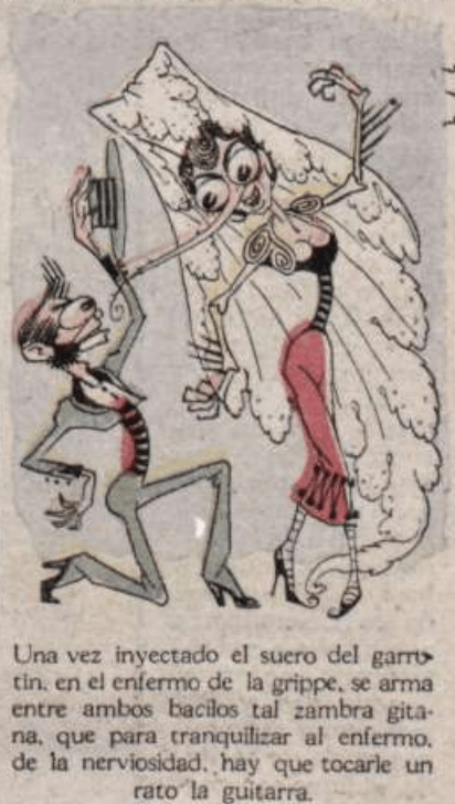Once the flamenco serum is injected in the patient with the flu, such a gypsy dance is mounted between both bacilli that to calm the patient from his nervousness, one has to play the guitar for a while.