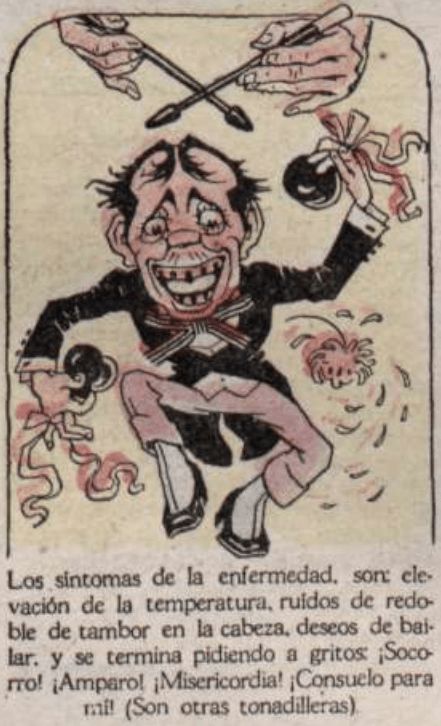 The symptoms of the disease are an increase in temperature, drum roll noises in the head, desire to dance, ending in the cries: Help! Protection! Mercy! Console me! (They are other pop singers)