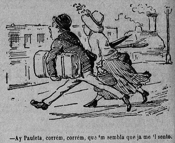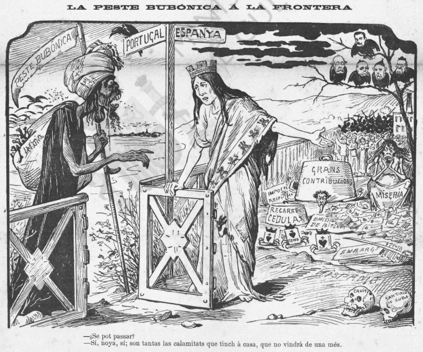 Woman: “Could you bypass us?” Plague (still carrying wares from India): “Yes, girl, yes; I have so many calamities at home that it will be a month before I come.” (La Campana de Gracia, Barcelona, 1899)