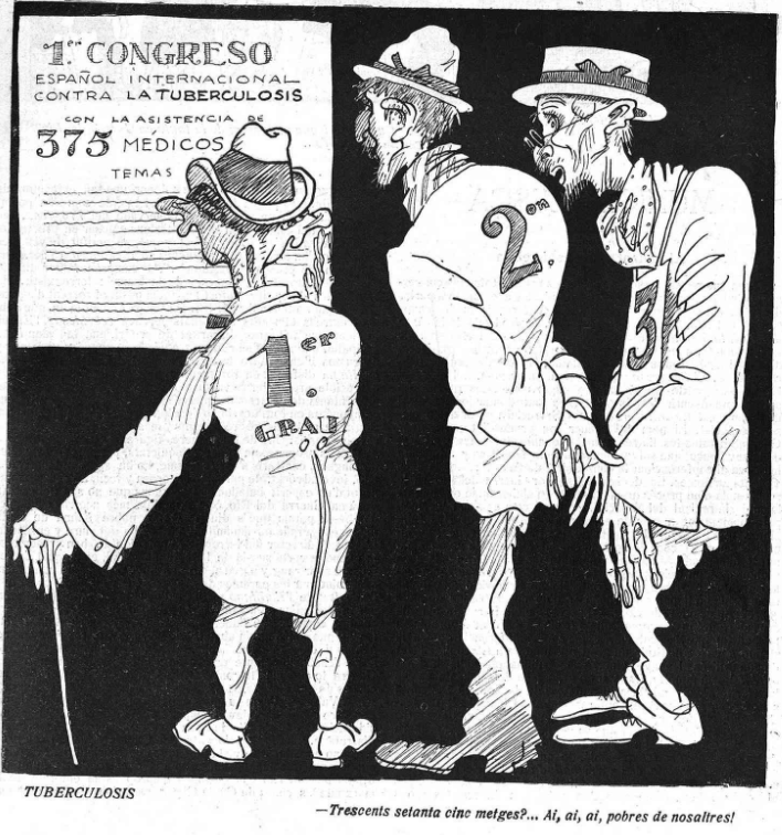 (Elderly figures apparently labeled according to the degree of their consumption affliction, reading poster for 1st Spanish International Congress Against Tuberculosis, convened with the help of 375 physicians.) “Three hundred and seventy-five doctors?… Alas, alas, alas, poor us!” (La Esquella de la torratxa, Barcelona, 1910)
