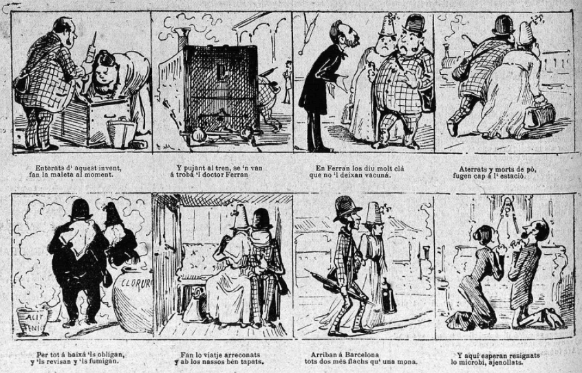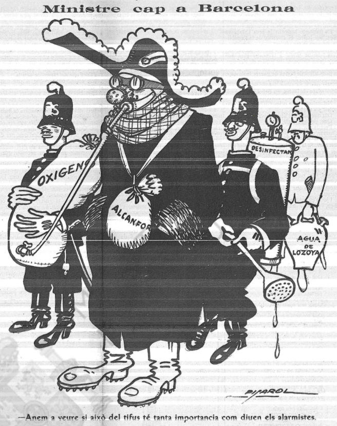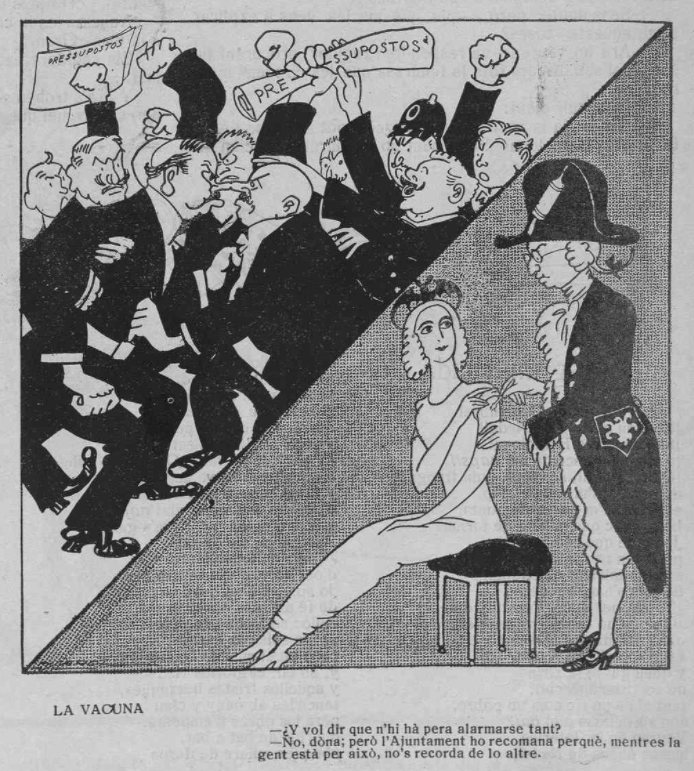 (City Council members fighting over budgets) “And does this mean there’s cause for alarm?” “No, ma’am; but the City Council recommends the vaccine because while the people are occupied with this, they won’t remember the other stuff.” (La Esquella de la torratxa, Barcelona, 1912)
