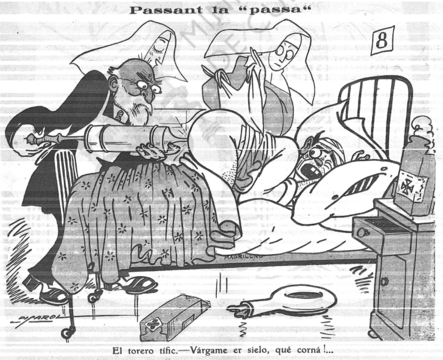 The typhus bullfighter. “Heaven forbid, what a horn!…” (This has to be the most explicit in the ongoing clystère theme.) (La Campana de Gracia, Barcelona, 1914)