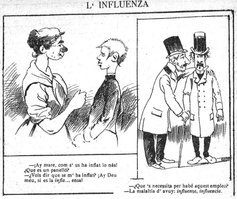 First panel: “Oh mother, how your nose is swollen! Is it chilblains?” “You mean, it’s inflated? Oh my God, if it’s the infla…enza!” Second panel: “What’s needed for this job?” “The disease of the day: influenza, influence.” (La Tomasa, Barcelona, 1892)