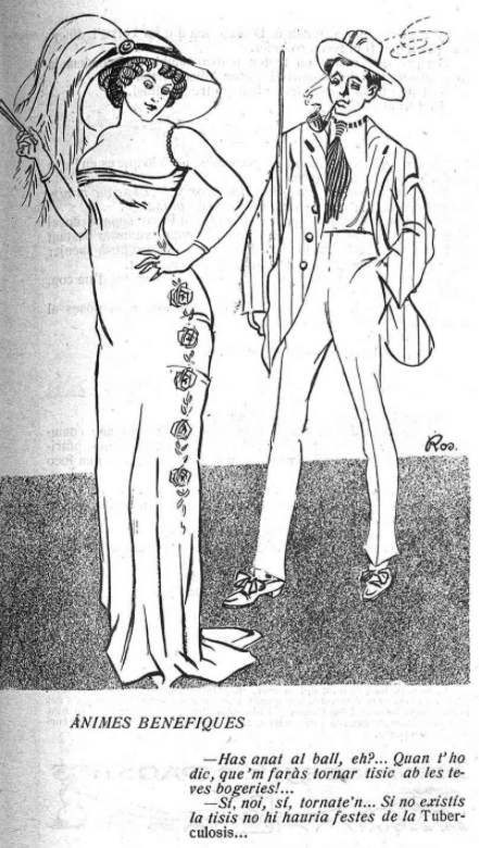 “You went to the dance, eh?… If you tell me that, you’ll make me go crazy with your madness!…” “Yes, boy, yes, come back… If consumption didn’t exist there would be no Tuberculosis parties…” (La Esquella de la torratxa, Barcelona, 1910)