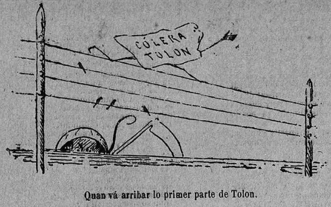 Marfuga is an olive oil producing region in Perugia, but I have no idea what the title signals. The individual panels in this cholera cartoon are amusing, however, mocking the urge to flee Barcelona for the countryside when news arrives of cholera in the French port of Toulon. (Apologies for the inept translations.) (La Esquella de la torratxa, Barcelona, 1884)