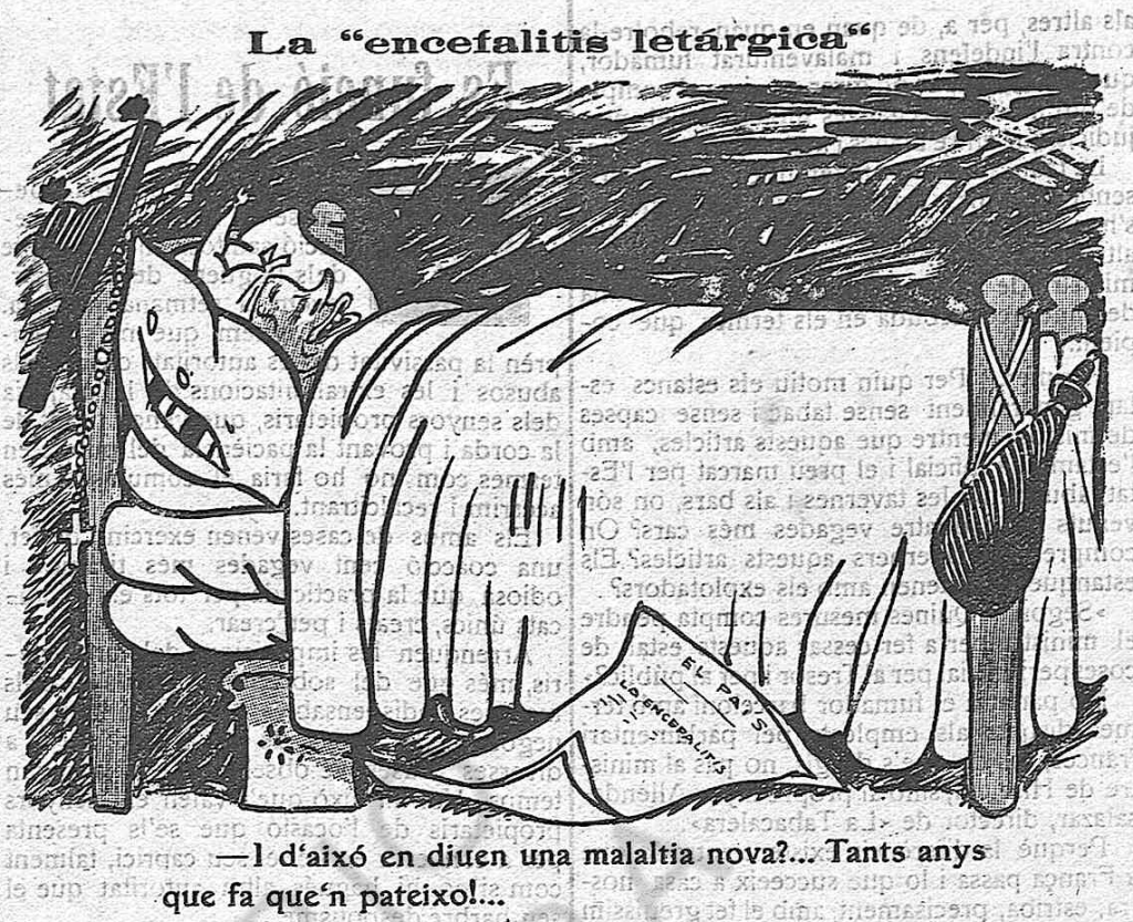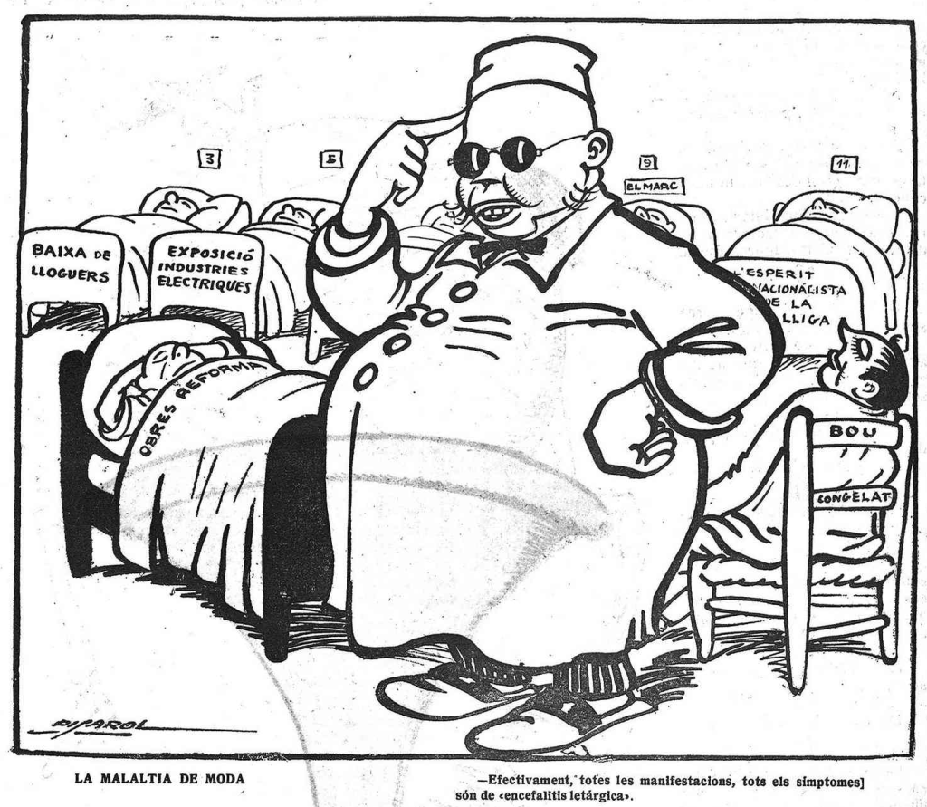 (Suffering patients include low rents, renovation works, the nationalist spirit of the league, frozen beef (?).) “Indeed, all the manifestations, all the symptoms are of the ‘encephalitis lethargica’.” (La Esquella de la torratxa, Barcelona, 1920)