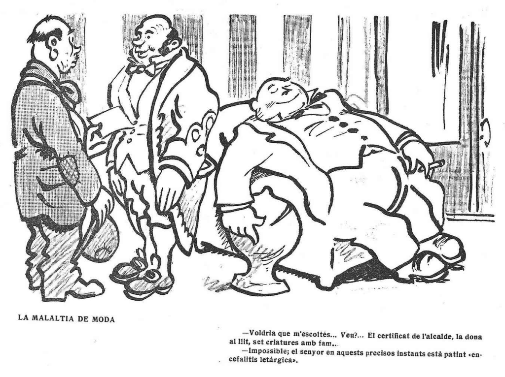 “Would you please hear me out… Voice?… The mayor’s certificate, the lady of the house in bed, with seven hungry children…” “Impossible; the gentleman is currently suffering from ‘encephalitis lethargica’ [sometimes called sleeping sickness].” (La Esquella de la torratxa, Barcelona, 1920)