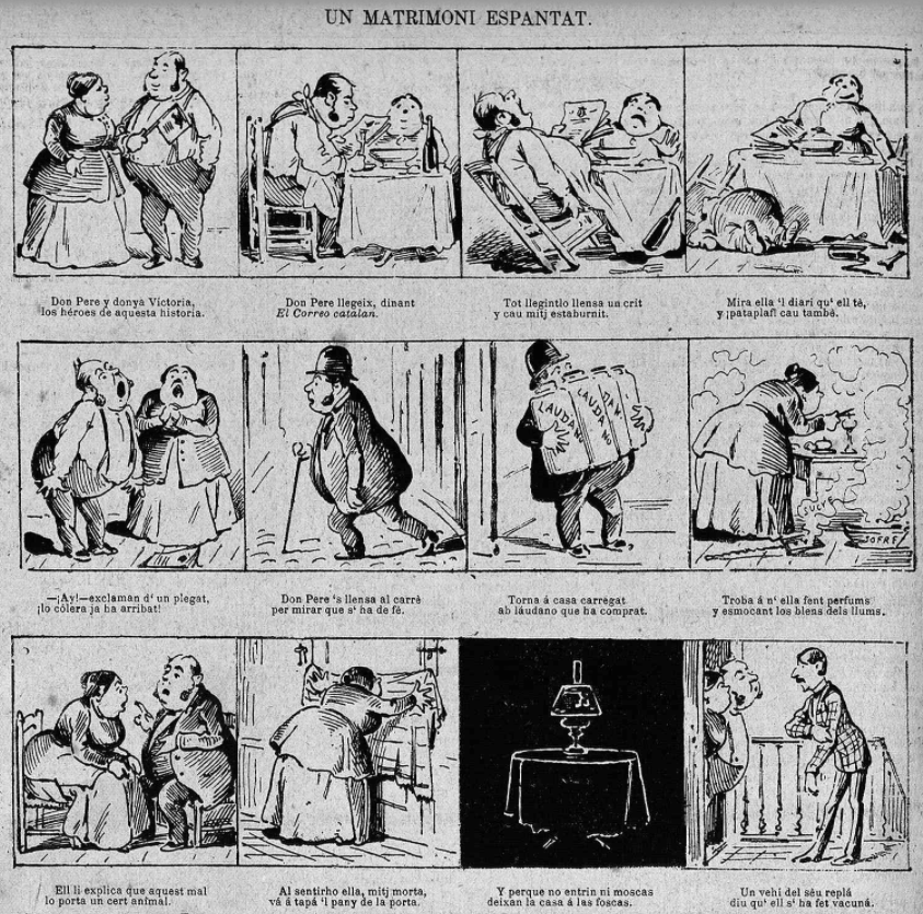 An example of the Catalan “auca” genre devoted to cholera, one whose rhymed couplets I won’t pretend to translate in full. A contented couple learns the city will be visited by cholera and copes using the nostrums available, including chasing after an elusive vaccine. They incur fumigation along their journey, returning weakened and resigned to await the microbes. (La Esquella de la torratxa, Barcelona, 1885)