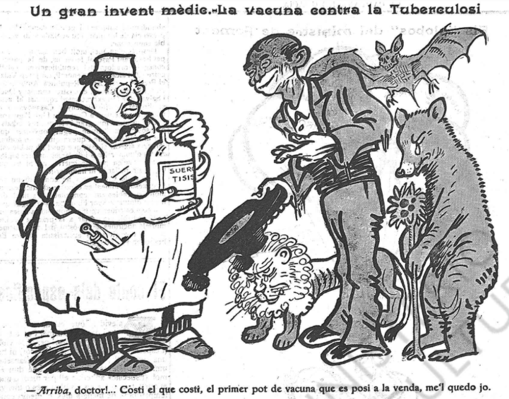 “Arriba, doctor! No matter what it costs, the first jar of vaccine to go on sale, I’ll keep it.” (La Campana de Gracia, Barcelona, 1921) (Clearly I need more context for this one.)